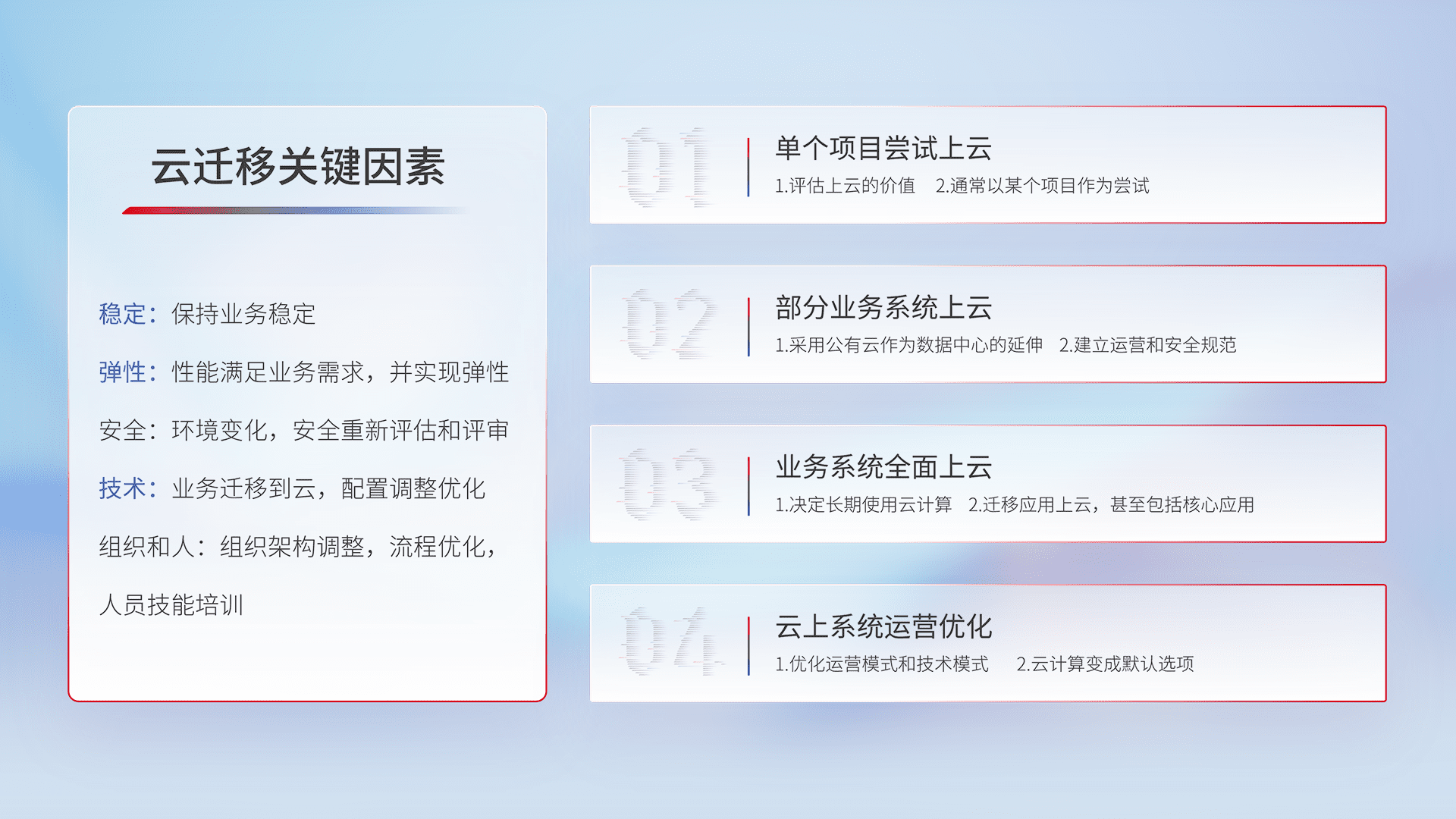 结合实际业务,,,从规划设计、、、云平台选型、、、、云原生改造、、、数据迁移、、、集成交付,,,迁移全过程为客户识别最佳上云路径,,,做好风险识别管理,,设计网络架构、、、、身份权限、、、、安全审计合规、、、操作审计、、、、日志审计、、监控告警策略、、、多站点容灾设计等,,对云上基础设施进行整体规划,,,提升IT治理水平,,以满足弹性、、、、高可用、、、、高性能的需求。。。