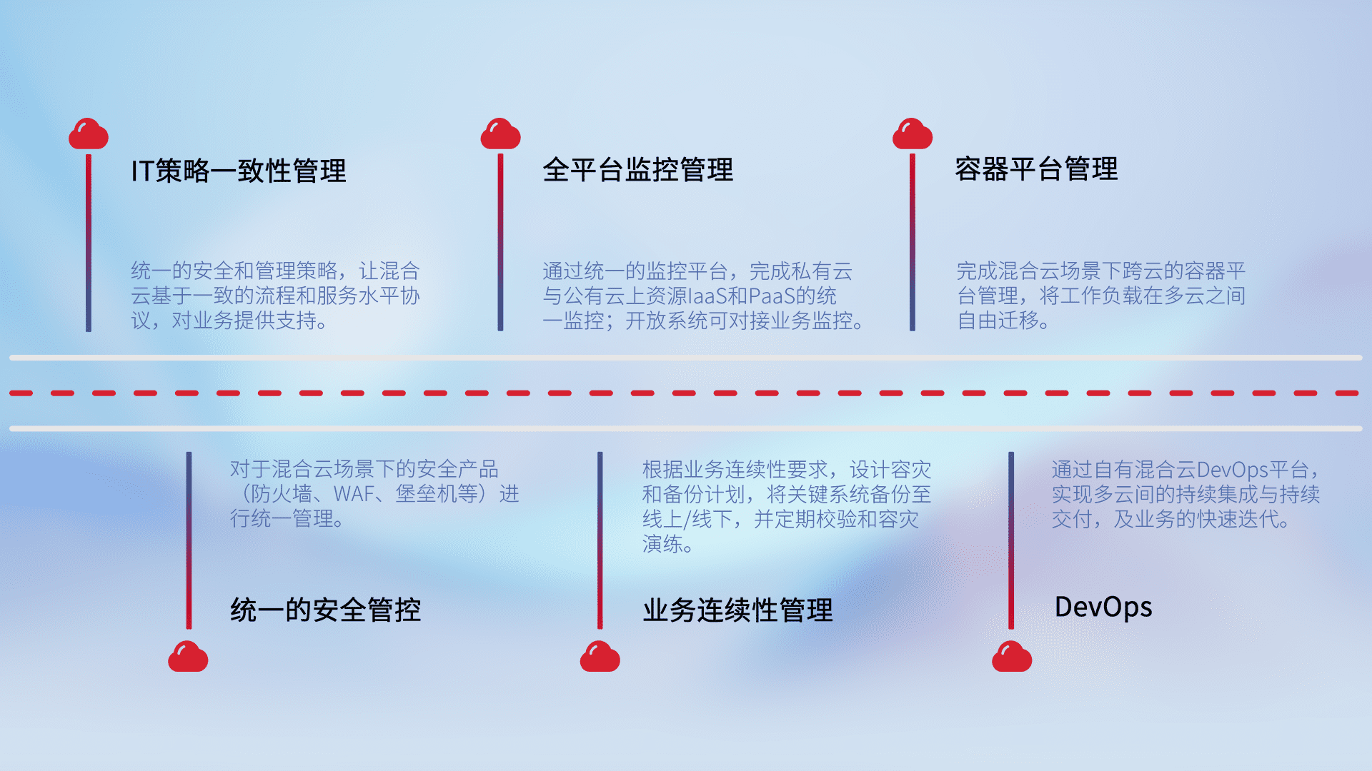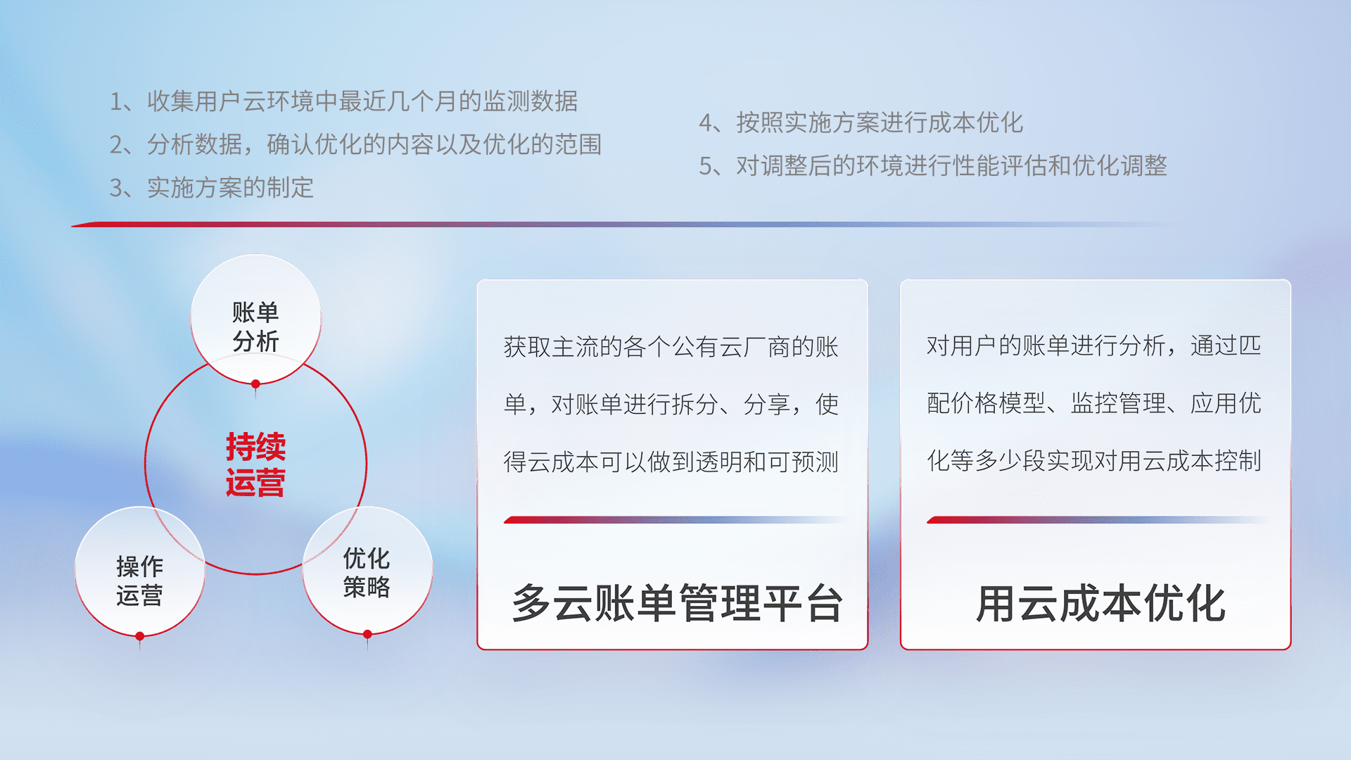 通过多云纳管,,,,以统一的资源数据模型把客户的云资源进行抽象和封装,,,,进而实现对多云资源的统一操作,,,,保障云资源管理的可靠性、、、稳定性与可用性。。量身定制化运维内容,,配置、、开发运维、、、补丁管理、、、备份、、、监控、、、、认证和访问管理、、审计和日常巡检等,,,保障在用云过程中的可靠度,,稳定度以及高可用率。。