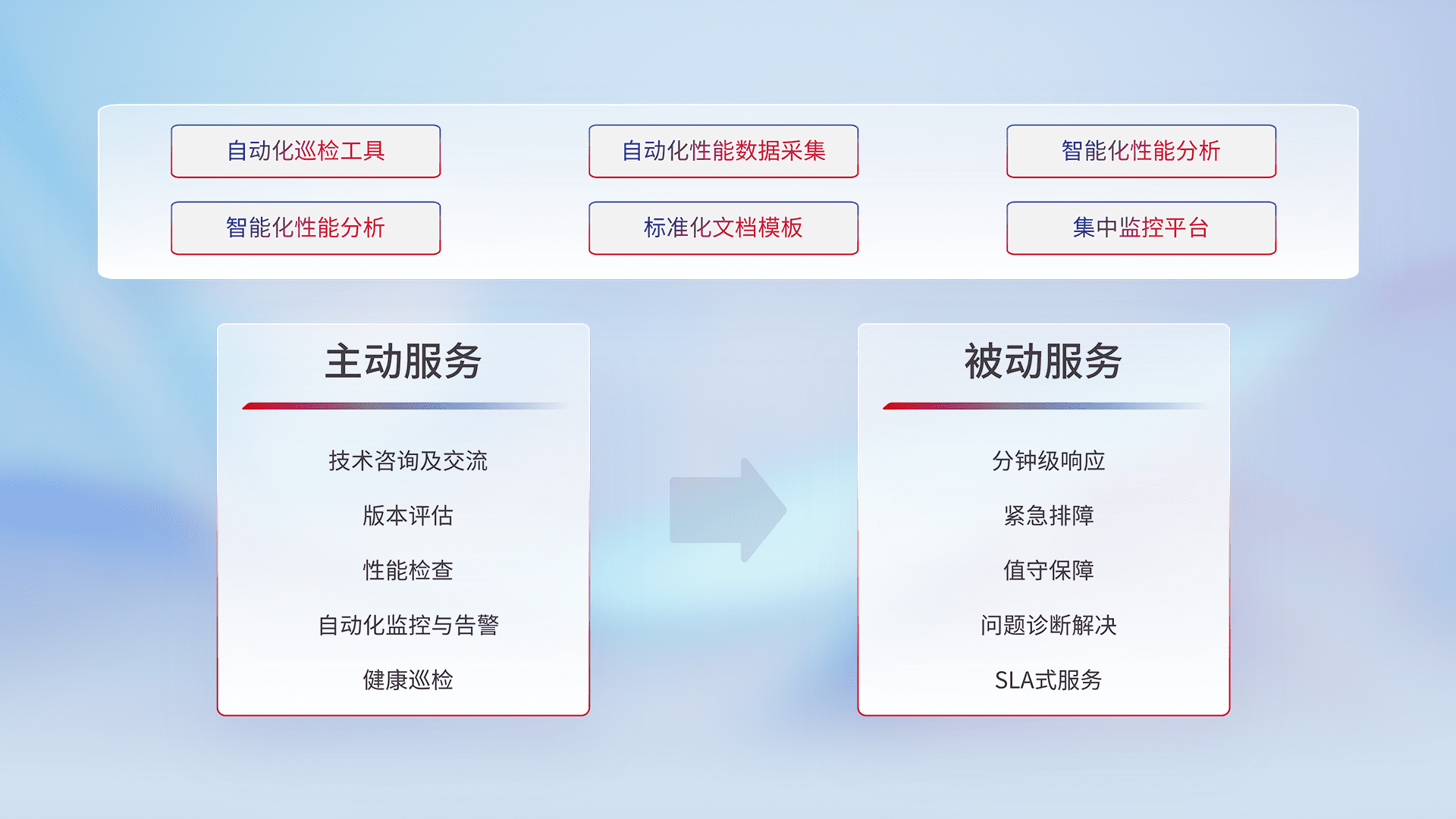 智能化工具和标准化文档,,保障服务质量,,,提供主动服务(包含技术咨询、、版本评估、、性能检查、、自动化监控与告警、、健康巡检)和被动服务包含(分钟级响应、、、紧急排障、、、值守保障、、、问题诊断解决、、SLA服务)。。。